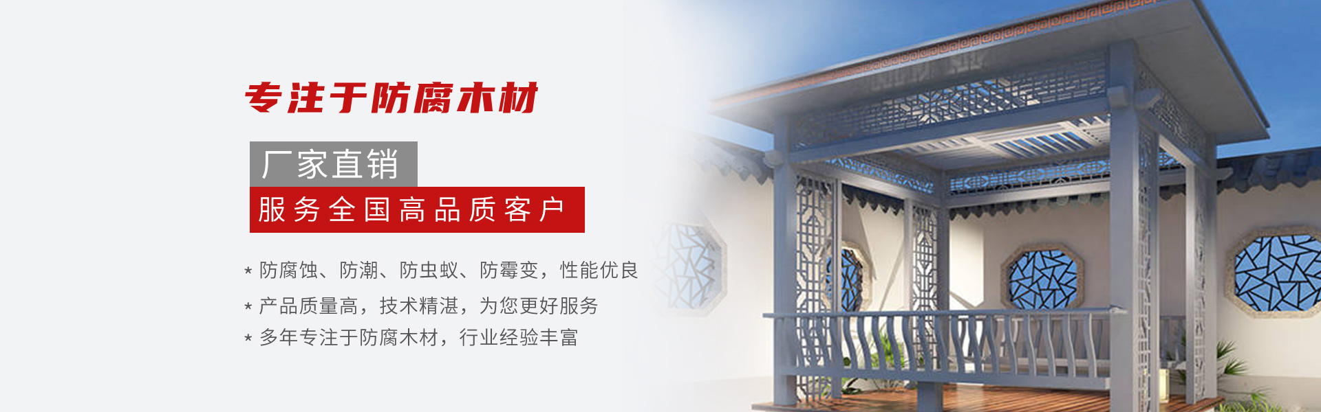 公司立足北京輻射周邊城市、力求創新,依靠好的產品和技術,以質量管理出效益,技術創新爭市場。經過CCA、ACQ等真空加壓浸泡防腐處理使木材達到防腐蝕、防潮、防蟲蟻、防霉變以及防水等特性做到天然實木、綠色環保,深受消費者青睞。公司將以好的產品,誠信的作風,熱情的服務,誠摯的期待與你攜手合作!歡迎廣大朋友來電咨詢!